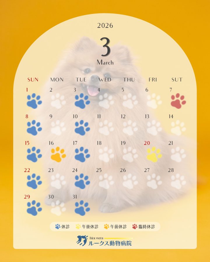 診療日程のお知らせ(2026年3月) 2026.02.13 3月につきましては、火曜日/日曜日終日休診、祝日午後休診3月7日 学会出席のため臨時休診3月16日 院長不在のため午前休診を予定しております。ご不便をおかけしますが、よろしくお願いいたします。 診療日程のお知らせ(2026年2月)